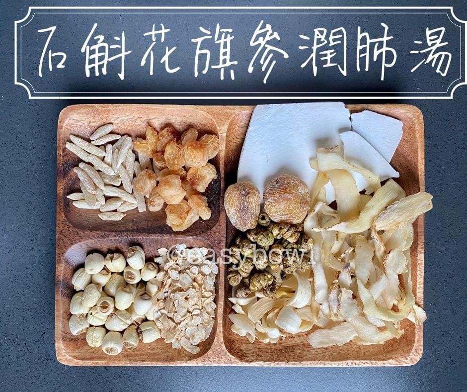 石斛、玉竹、元肉、茯神、白蓮、百合、花旗參、蜜棗、麥冬